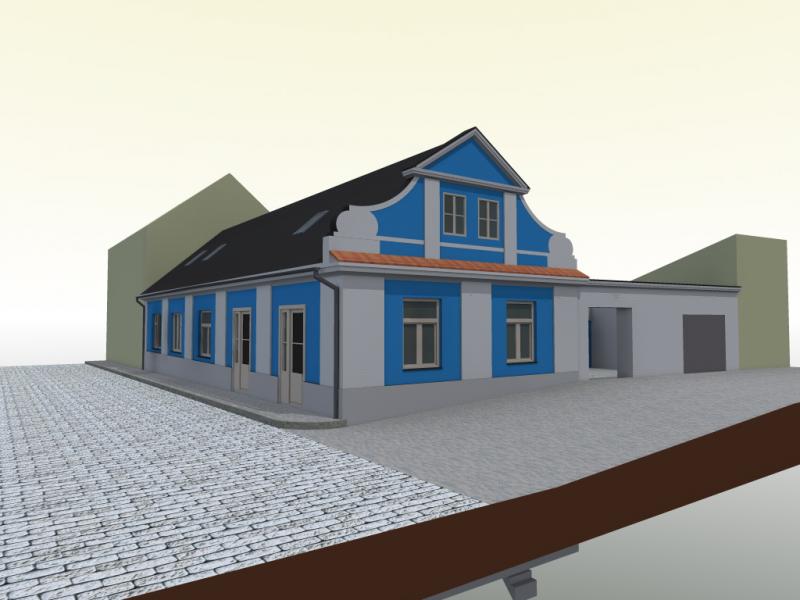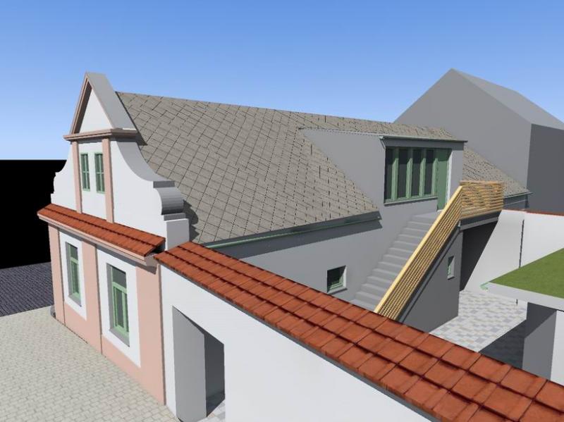 Fotografie původního stavu, návrh ve vizualizacích, nová střecha se vstupním vikýřem a návrh barevnosti fasády. Č. p. 108 mělo v průběhu doby mnoho barev - okrovou, zelenou, modrou, žlutou, bílou ... všechny tyto barvy jsou ve vrstvách zachovaných omítek.